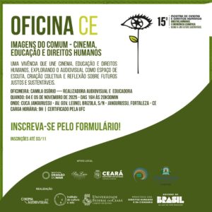 A Prof.ª Geovana Cartaxo, Coordenadora do Curso de Graduação em Direito, desta Escola, comunica que estão abertas, até 03 de novembro, as inscrições para a Oficina Imagens do Comum: Cinema, Educação e Direitos Humanos, uma proposta de formação que visa promover a reflexão crítica acerca da cultura dos direitos humanos a partir do contato com a linguagem e a prática audiovisual. A atividade acontece dentro da programação da 15ª Mostra Cinema e Direitos Humanos, uma produção do Curso de Cinema e Audiovisual da Universidade Federal do Ceará (UFC) e realização do Ministério dos Direitos Humanos e da Cidadania.